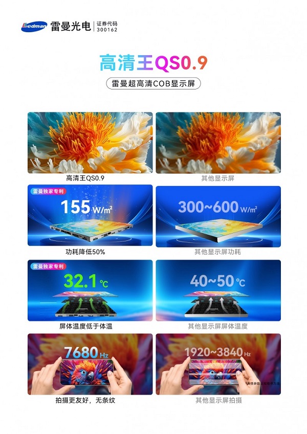 作為擁有 20 余年技術(shù)沉淀的行業(yè)頭部企業(yè),雷曼光電自 8 年前率先布局 COB 技術(shù)以來(lái),已完成多輪技術(shù)迭代,累計(jì)拿下超 100 項(xiàng)國(guó)內(nèi)外 COB 前沿顯示專利。此次推出的高清王QS0.9產(chǎn)品,在實(shí)現(xiàn)0.9mm間距超高清顯示的同時(shí),更是打破超高清大屏“高價(jià)門檻”,價(jià)格定位貼合市場(chǎng)需求;在能耗方面,相較傳統(tǒng)產(chǎn)品節(jié)省50%,長(zhǎng)期使用可顯著降低企業(yè)運(yùn)營(yíng)成本。