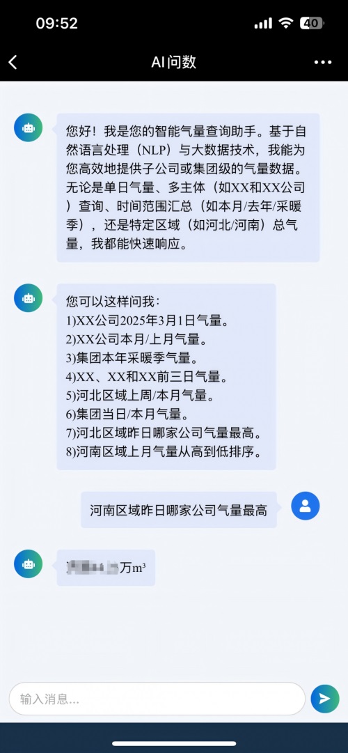 在數據服務方面,中裕能源上線了“AI問數”智能氣量查詢助手。該工具基于自然語言處理(NLP)與大數據分析技術,為氣量日報模塊的授權用戶提供全天候、多維度、快速的數據問答服務。