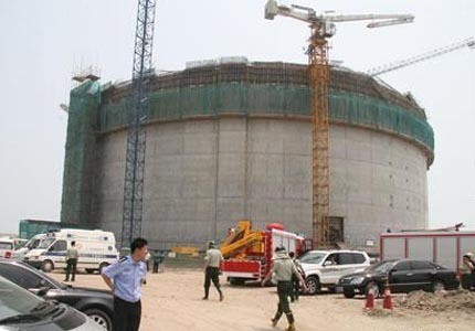 中石油江蘇液化天然氣(LNG)接收站工程位于江蘇如東縣洋口港太陽島,由上海電力建筑工程公司承建。施工現(xiàn)場在建的1號儲罐鋼筋網(wǎng)發(fā)生滑落引發(fā)事故。