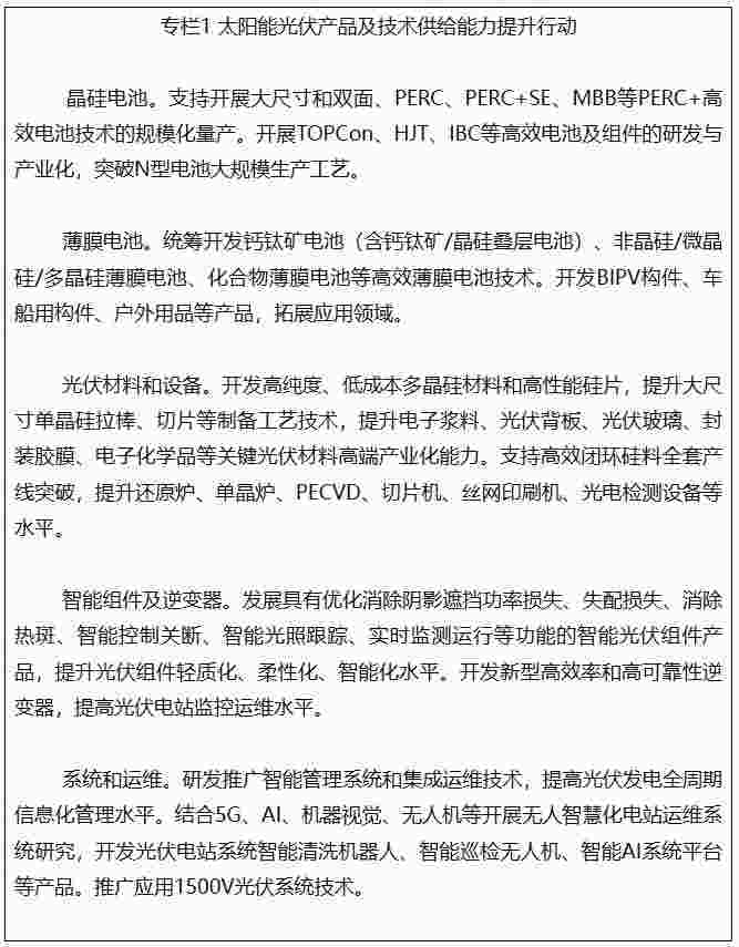 加快智能光伏創(chuàng)新突破,發(fā)展高純硅料、大尺寸硅片技術(shù),支持高效低成本晶硅電池生產(chǎn),推動(dòng)N型高效電池、柔性薄膜電池、鈣鈦礦及疊層電池等先進(jìn)技術(shù)的研發(fā)應(yīng)用,提升規(guī)模化量產(chǎn)能力。鼓勵(lì)開發(fā)先進(jìn)適用的智能光伏組件,發(fā)展智能逆變器、控制器、匯流箱、跟蹤系統(tǒng)等關(guān)鍵部件。加大對(duì)關(guān)鍵技術(shù)裝備、原輔料研發(fā)應(yīng)用的支持力度。鼓勵(lì)開發(fā)安全便捷的戶用智能光伏系統(tǒng),鼓勵(lì)發(fā)展光伏充電寶、穿戴裝備、交通工具等移動(dòng)能源產(chǎn)品。探索建立光伏“碳足跡”評(píng)價(jià)標(biāo)準(zhǔn)并開展認(rèn)證。加快構(gòu)建光伏供應(yīng)鏈溯源體系,推動(dòng)光伏組件回收利用技術(shù)研發(fā)及產(chǎn)業(yè)化應(yīng)用。