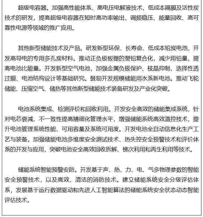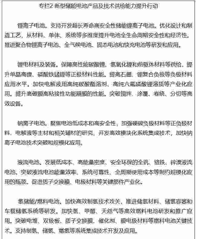 加強(qiáng)新型儲(chǔ)能電池產(chǎn)業(yè)化技術(shù)攻關(guān),推進(jìn)先進(jìn)儲(chǔ)能技術(shù)及產(chǎn)品規(guī)模化應(yīng)用。研究突破超長(zhǎng)壽命高安全性電池體系、大規(guī)模大容量高效儲(chǔ)能、交通工具移動(dòng)儲(chǔ)能等關(guān)鍵技術(shù),加快研發(fā)固態(tài)電池、鈉離子電池、氫儲(chǔ)能/燃料電池等新型電池。推廣智能化生產(chǎn)工藝與裝備、先進(jìn)集成及制造技術(shù)、性能測(cè)試和評(píng)估技術(shù)。提高鋰、鎳、鈷、鉑等關(guān)鍵資源保障能力,加強(qiáng)替代材料的開發(fā)應(yīng)用。推廣基于優(yōu)勢(shì)互補(bǔ)功率型和能量型電化學(xué)儲(chǔ)能技術(shù)的混合儲(chǔ)能系統(tǒng)。支持建立鋰電等全生命周期溯源管理平臺(tái),開展電池碳足跡核算標(biāo)準(zhǔn)與方法研究,探索建立電池產(chǎn)品碳排放管理體系。