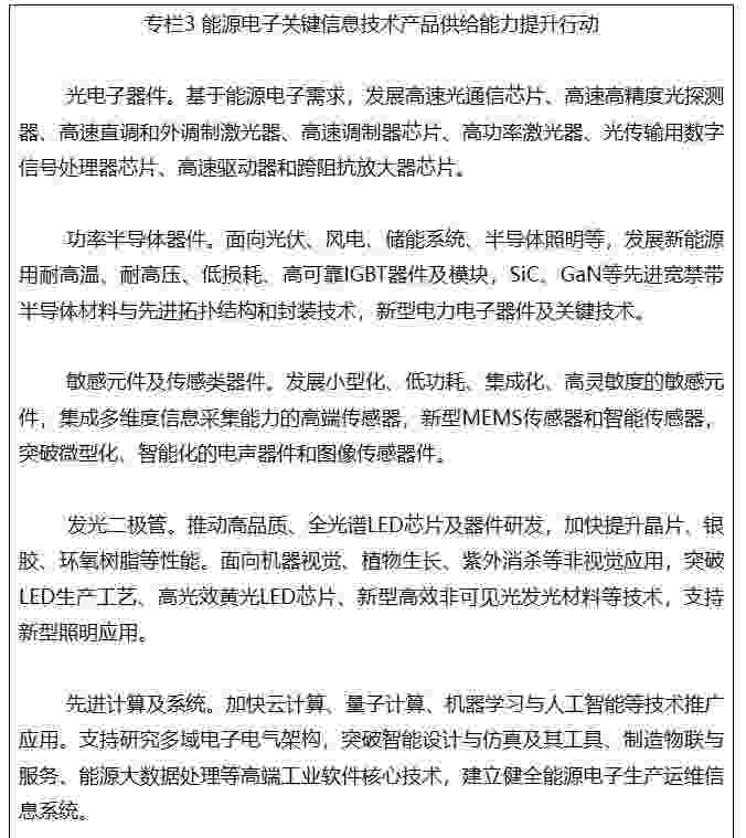 加強(qiáng)面向新能源領(lǐng)域的關(guān)鍵信息技術(shù)產(chǎn)品開發(fā)和應(yīng)用,主要包括適應(yīng)新能源需求的電力電子、柔性電子、傳感物聯(lián)、智慧能源信息系統(tǒng)及有關(guān)的先進(jìn)計(jì)算、工業(yè)軟件、傳輸通信、工業(yè)機(jī)器人等適配性技術(shù)及產(chǎn)品。研究小型化、高性能、高效率、高可靠的功率半導(dǎo)體、傳感類器件、光電子器件等基礎(chǔ)電子元器件及專用設(shè)備、先進(jìn)工藝,支持特高壓等新能源供給消納體系建設(shè)。推動(dòng)能源電子產(chǎn)業(yè)數(shù)字化、智能化發(fā)展,突破全環(huán)境仿真平臺(tái)、先進(jìn)算力算法、工業(yè)基礎(chǔ)軟件、人工智能等技術(shù)。推動(dòng)信息技術(shù)相關(guān)裝備及儀器創(chuàng)新發(fā)展。