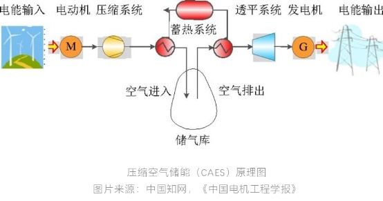 壓縮空氣儲(chǔ)能(CAES)在用電低谷,通過壓縮機(jī)把空氣壓縮成高壓空氣,在用電高峰,釋放高壓空氣,驅(qū)動(dòng)膨脹機(jī)就可以驅(qū)動(dòng)發(fā)電機(jī)發(fā)電。
