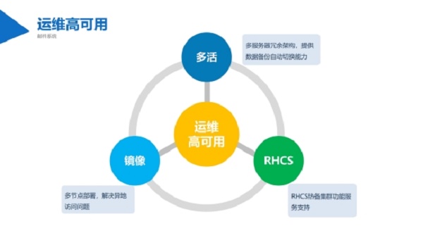 Coremail郵件系統有多個高可用模塊,包括多層次容災服務,高級郵件備份、本地多活、私有云鏡像容災與異地部署方案。覆蓋多種異常場景,全面解決斷電、斷服、斷網突發情況。多活高可用機制可以保障系統的穩定不掉線,滿足Coremail郵件系統的大、中、小型客戶需求。軟硬件故障自動切換,故障修復自動回切,保證業務不掉線。
