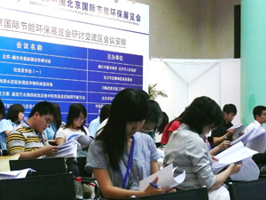 記者認(rèn)真閱讀2010中國北京國際節(jié)能環(huán)保展覽會的宣傳資料(衛(wèi)維 攝)