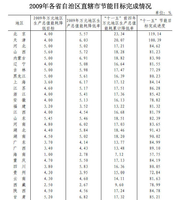 各地區節能目標責任評價考核結果為:北京、天津、河北、山西、內蒙古、遼寧、上海、江蘇、福建、江西、山東、湖北、廣東、重慶、四川、云南、陜西、寧夏18個省(區、市)考核結果為超額完成等級;吉林、黑龍江、浙江、安徽、河南、湖南、廣西、海南、甘肅、青海10個省(區)考核結果為完成等級;西藏自治區考核結果為基本完成等級;貴州、新疆2省(區)考核結果為未完成等級。